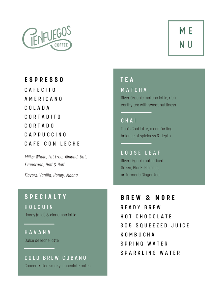 The menu also shines with unique offerings like the Holguin and Cold Brew Cubano, elevating the coffee experience to new heights. Tea enthusiasts can enjoy refreshing Matcha and spiced Chai. Beyond beverages, Cienfuegos Coffee tantalizes with delicious bites like pastelillos and croquettes, perfect for any event.